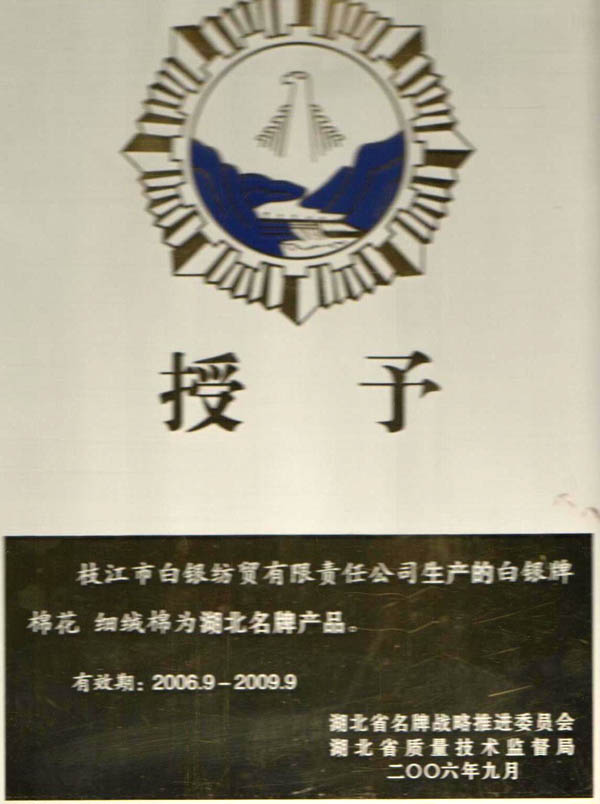白銀牌棉花細絨棉為湖北名牌產(chǎn)品